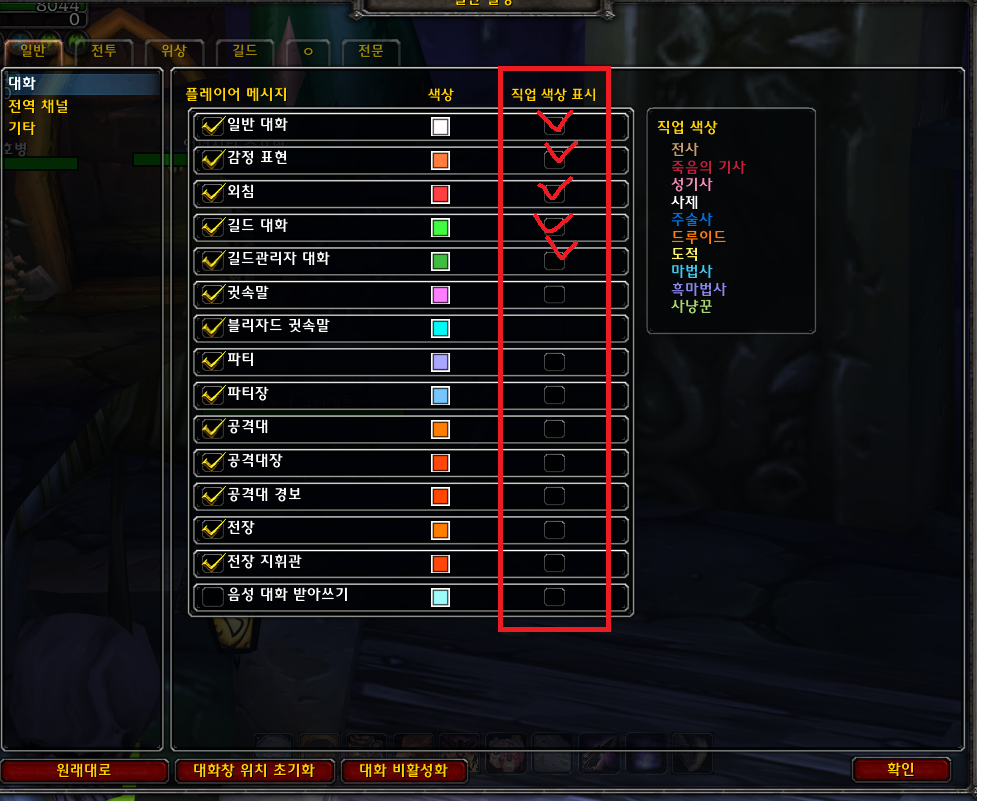 | 채팅창 직업 색 표시 매크로 2022년 10월 패치돼서 채팅창 우클릭 설정에 들어가서 직업 색 표시 체크해야됨. |